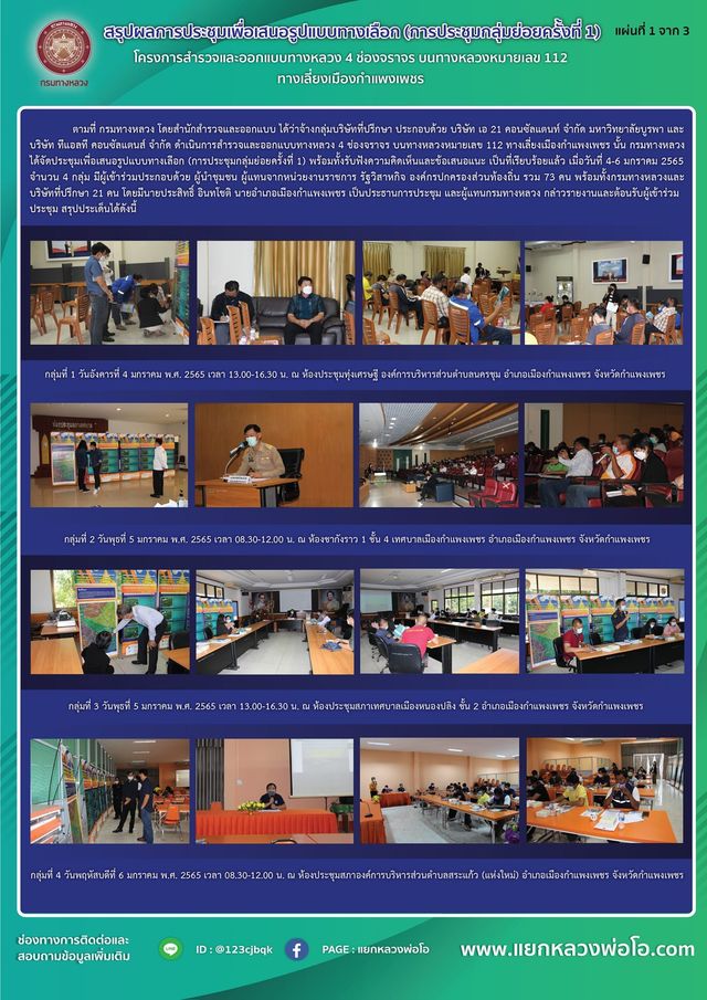 สรุปผลการประชุมเพื่อเสนอรูปแบบทางเลือก (การประชุมกลุ่มย่อยครั้งที่ 1) ระหว่างวันที่ 4-6 มกราคม 2565 โครงการสำรวจและออกแบบทางหลวง 4 ช่องจราจร บนทางหลวงหมายเลข 112 ตอนทางเลี่ยงเมืองกำแพงเพชร