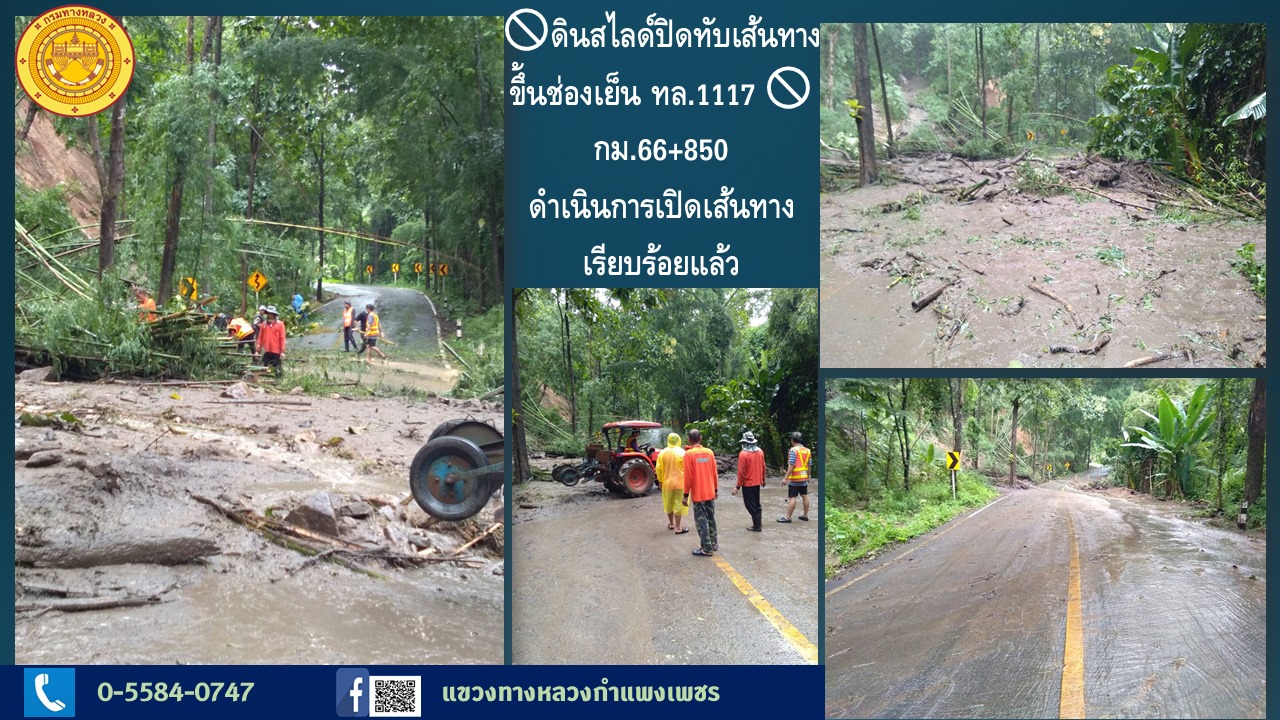 ข่าวประชาสัมพันธ์แขวงทางหลวงกำแพงเพชร วันที่ 26 กันยายน 2564 "ดินสไลด์ปิดทับเส้นทางขึ้นช่องเย็น ทล.1117"