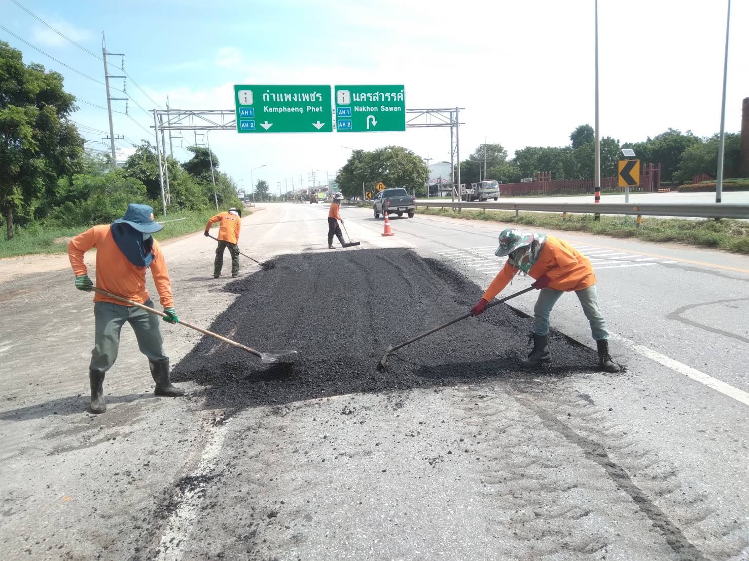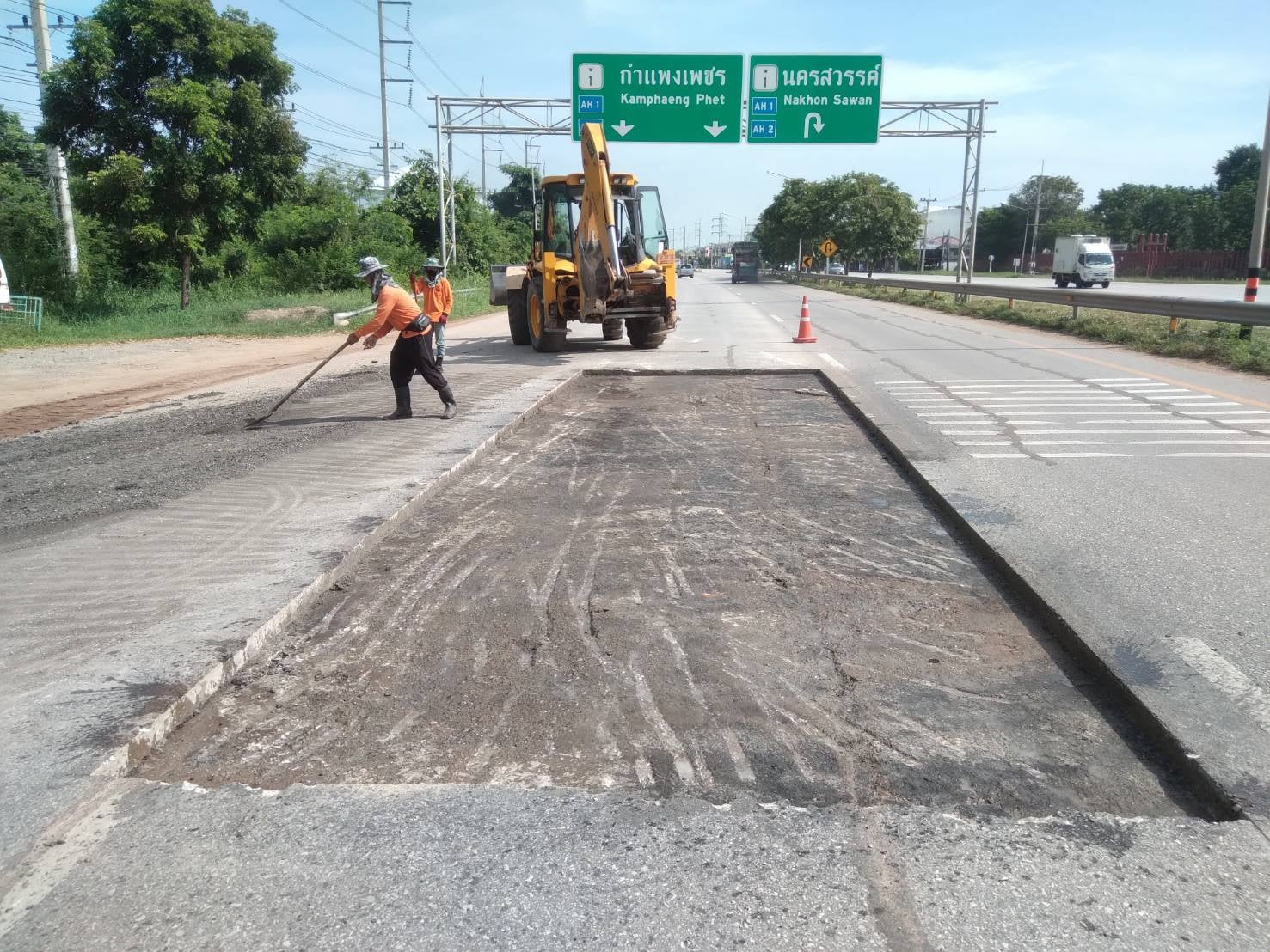 แขวงทางหลวงกำแพงเพชร โดย หมวดทางหลวงคลองขลุง ดำเนินการปะซ่อมผิวทาง ทางหลวงหมายเลข 1 ตอนโนนปอแดง - ปากดง ที่ กม.411+493 เพื่อให้ความสะดวก และปลอดภัยแก่ผู้ใช้เส้นทาง