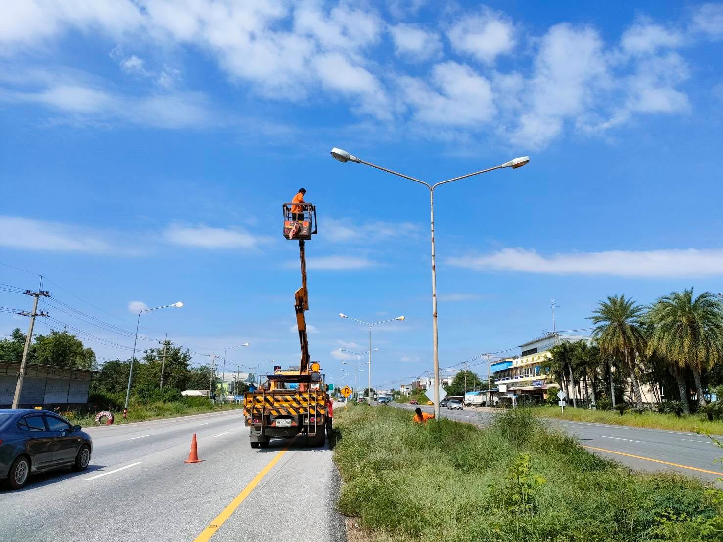 แขวงทางหลวงกำแพงเพชร โดย งานปรับซ่อม ดำเนินการซ่อมแซมเปลี่ยนอุปกรณ์ไฟฟ้าแสงสว่าง ทางหลวงหมายเลข 1 ตอน โนนปอแดง - ปากดงระหว่าง กม.386+450 - กม.386+675 เพื่อความสะดวก และความปลอดภัยแก่ผู้ใช้เส้นทาง