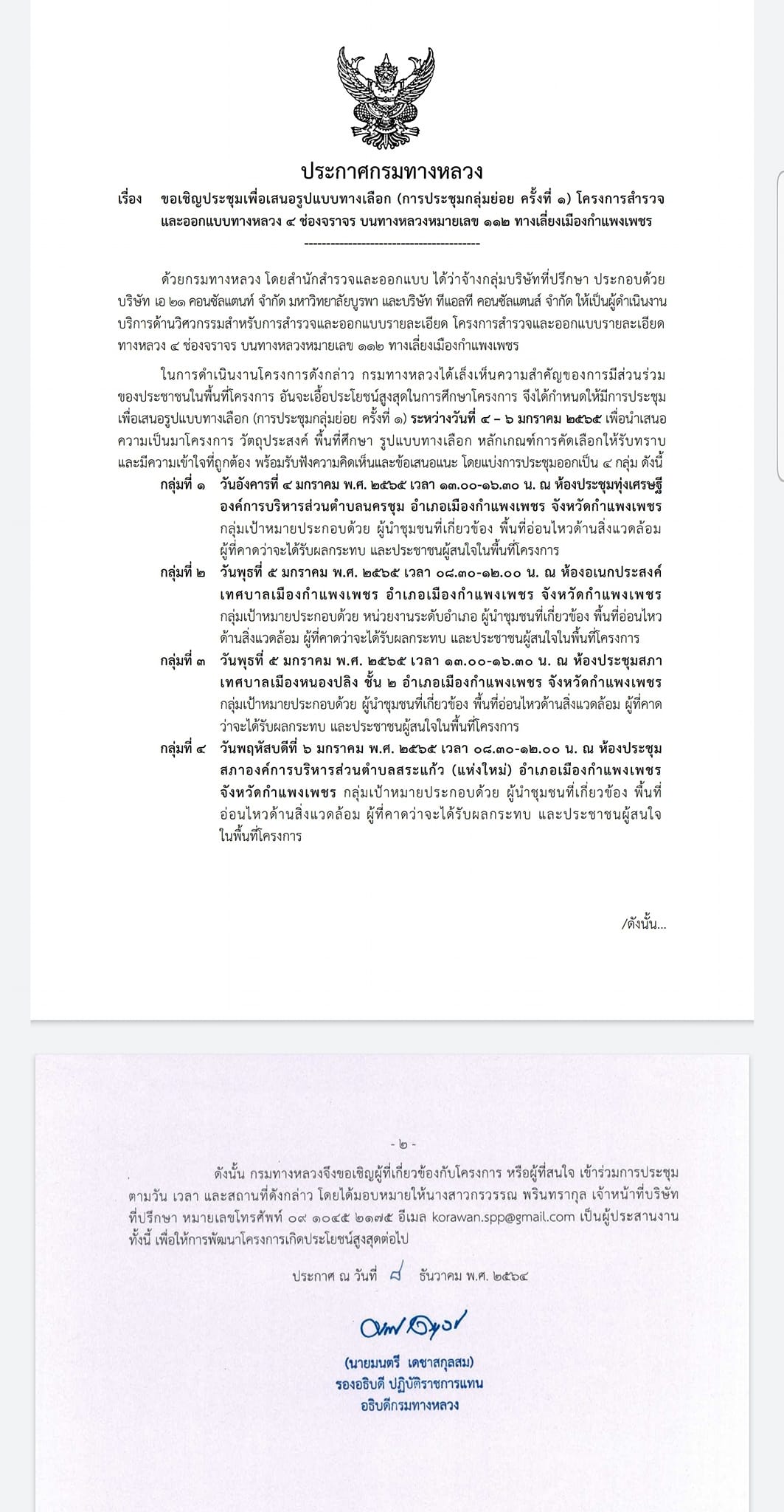 ขอเชิญผู้สนใจเข้าร่วมประชุมเพื่อเสนอรูปแบบทางเลือก (การประชุมกลุ่มย่อยครั้งที่ 1) โครงการสำรวจและออกแบบทางหลวง 4 ช่องจราจร บนทางหลวงหมายเลข 112 ทางเลี่ยงเมืองกำแพงเพชร