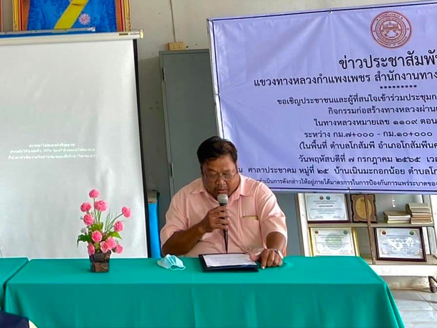 วันพฤหัสบดี ที่ 7 กรกฎาคม 2565 เวลา 13.00 น. นายชัยศิริ ผูกใจเพื่อน ผู้อำนวยการแขวงทางหลวงกำแพงเพชร มอบหมายให้นายสุชาติ ตาทิพย์ รองผู้อำนวยการฝ่ายวิศวกรรม นำคณะหัวหน้าหมวดทางหลวง และเจ้าหน้าที่แขวงฯ จัดประชุมการมีส่วนร่วมของประชาชน เพื่อปรับปรุงขยายผิวไหล่ทางจราจร โครงการก่อสร้างทางหลวงผ่านย่านชุมชน ทางหลวงหมายเลข 1109 ตอนวังเจ้า-โละโคะ ระหว่าง กม.7+000-กม.10+000 ณ ศาลาประชาคม หมู่25 บ้านเนินมะกอกน้อย ตำบลโกสัมพี ในการนี้ นายสมพร พูลเปี่ยม รองนายกองค์การบริหารส่วนตำบลโกสัมพี เป็นประธานในพิธีเปิดการประชุม ซึ่งในที่ประชุมมีมติเห็นด้วยในการให้ดำเนินโครงการ