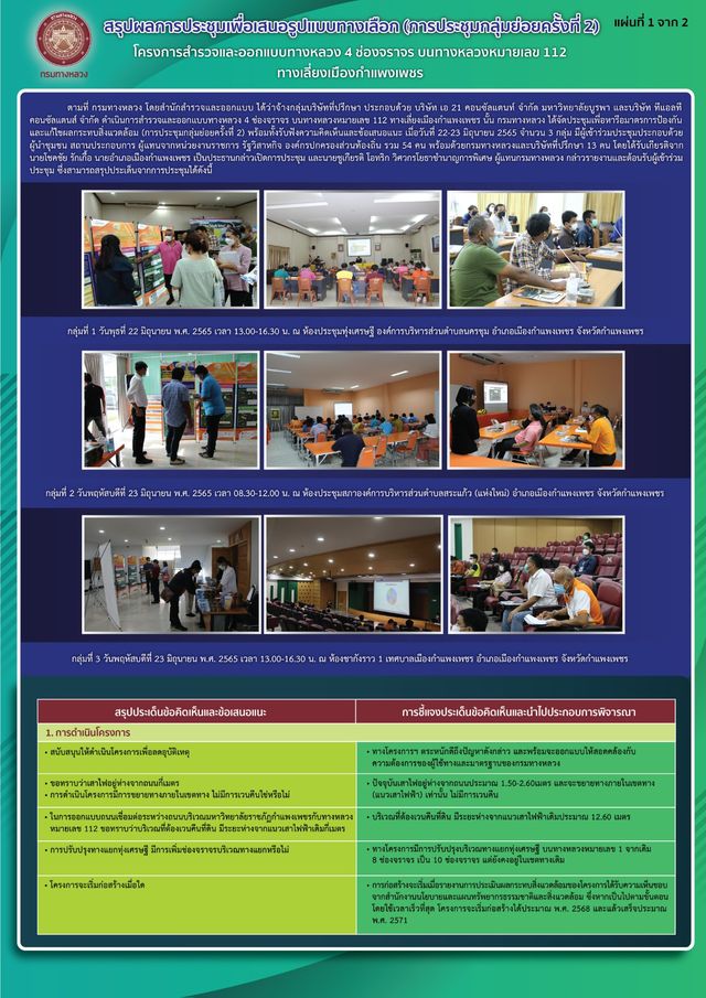 สรุปผลการประชุมเพื่อหารือมาตรการป้องกันและแก้ไขผลกระทบสิ่งแวดล้อม (การประชุมกลุ่มย่อย ครั้งที่ 2 เมื่อวันที่ 22-23 มิถุนายน 2565) โครงการสำรวจและออกแบบทางหลวง 4 ช่องจราจร บนทางหลวงหมายเลข 112 ทางเลี่ยงเมืองกำแพงเพชร