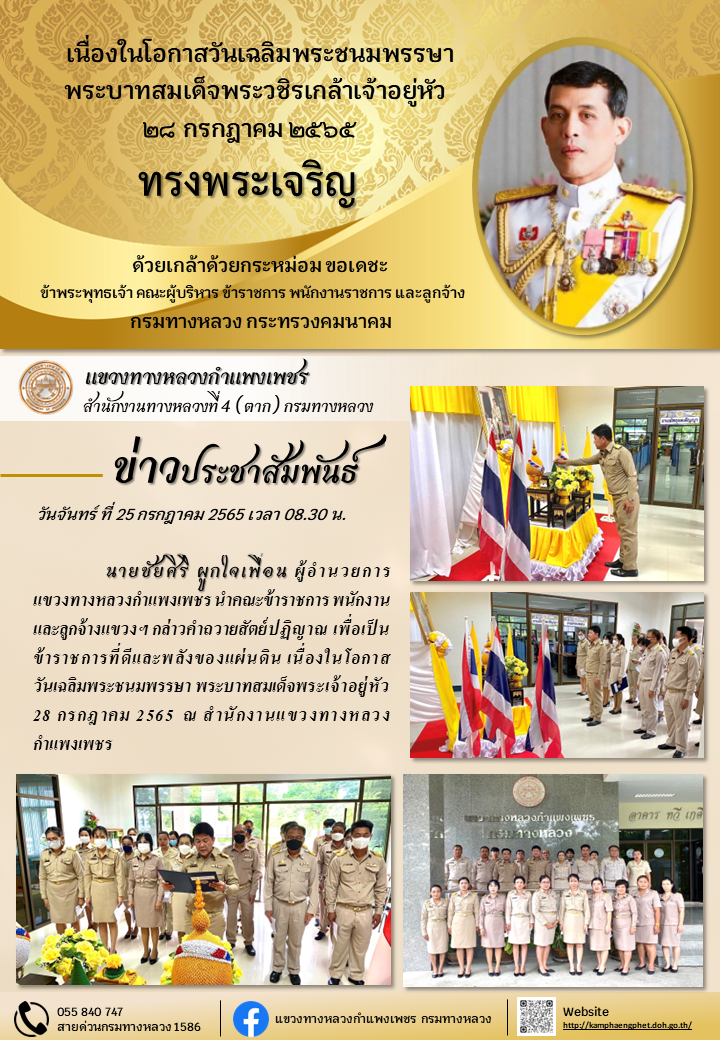 ข่าวประชาสัมพันธ์ วันจันทร์ ที่ 25 กรกฎาคม 2565 เวลา 08.30 น. นายชัยศิริ ผูกใจเพื่อน ผู้อำนวยการแขวงทางหลวงกำแพงเพชร นำคณะข้าราชการ และเจ้าหน้าที่ในสังกัด กล่าวคำถวายสัตย์ปฏิญาณ เพื่อเป็นข้าราชการที่ดีและพลังของแผ่นดิน เนื่องในโอกาสวันเฉลิมพระชนมพรรษา พระบาทสมเด็จพระเจ้าอยู่หัว 28 กรกฎาคม 2565 ณ สำนักงานแขวงทางหลวงกำแพงเพชร