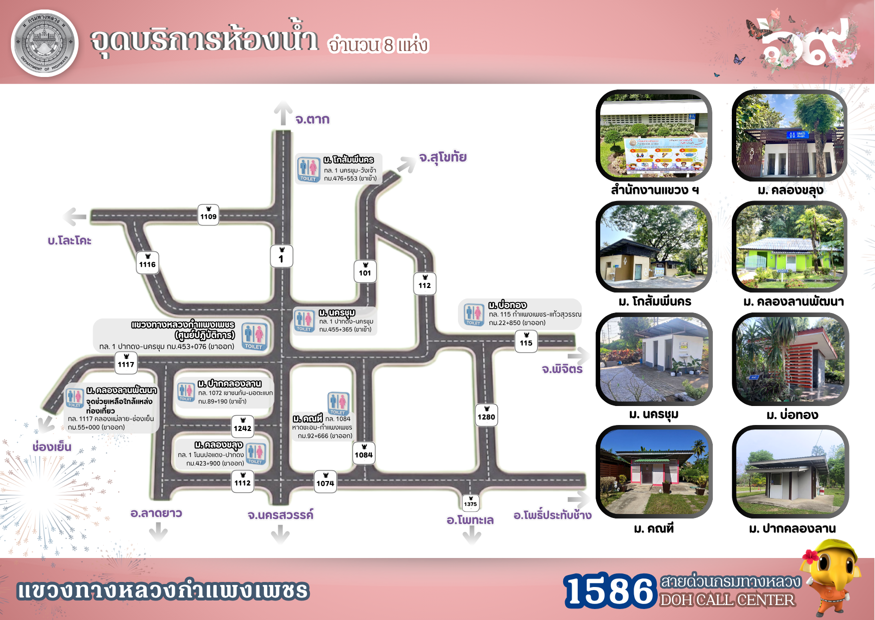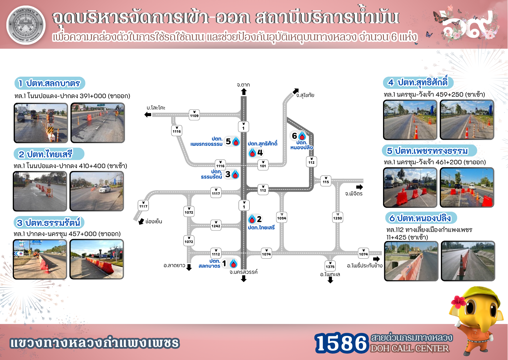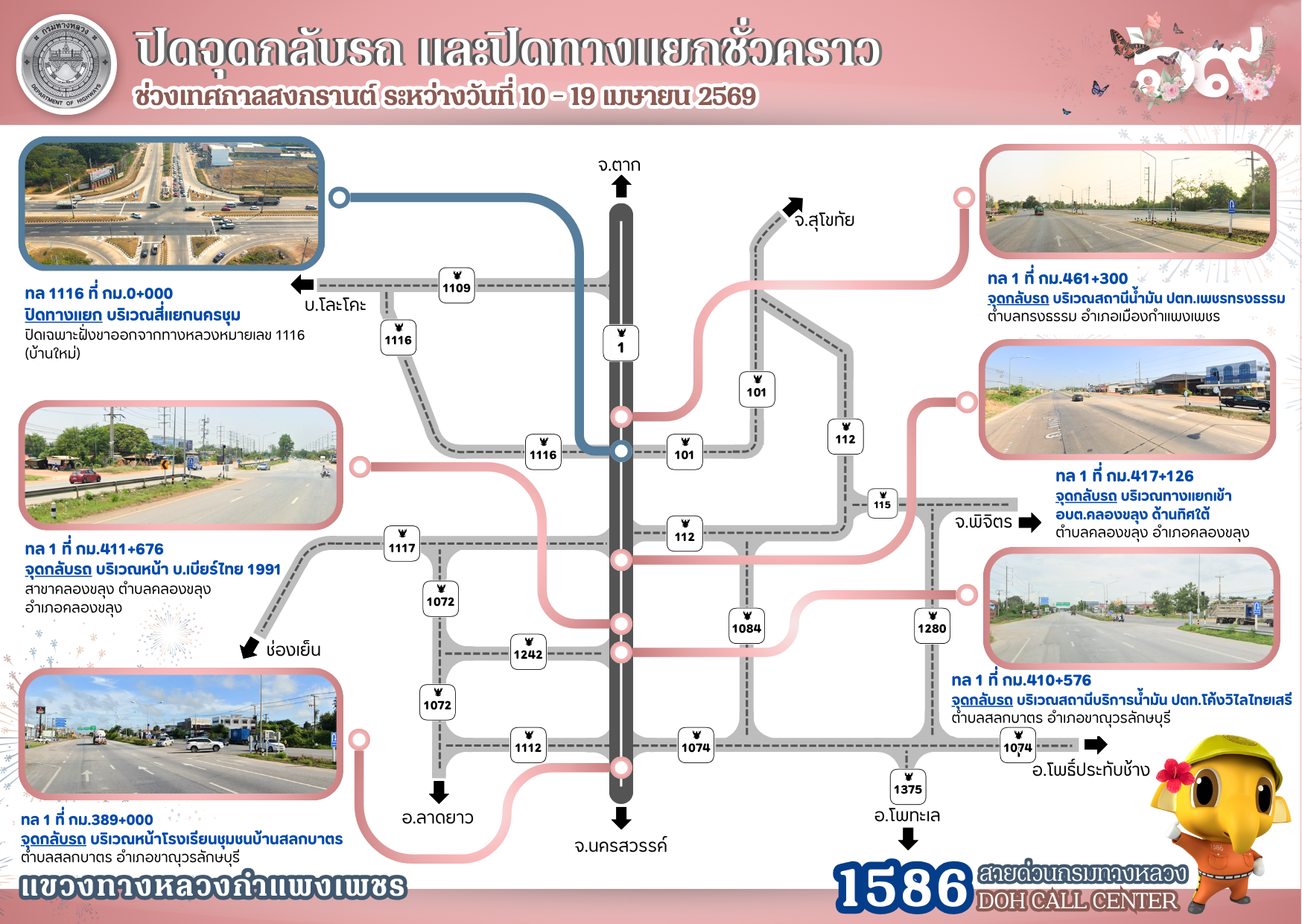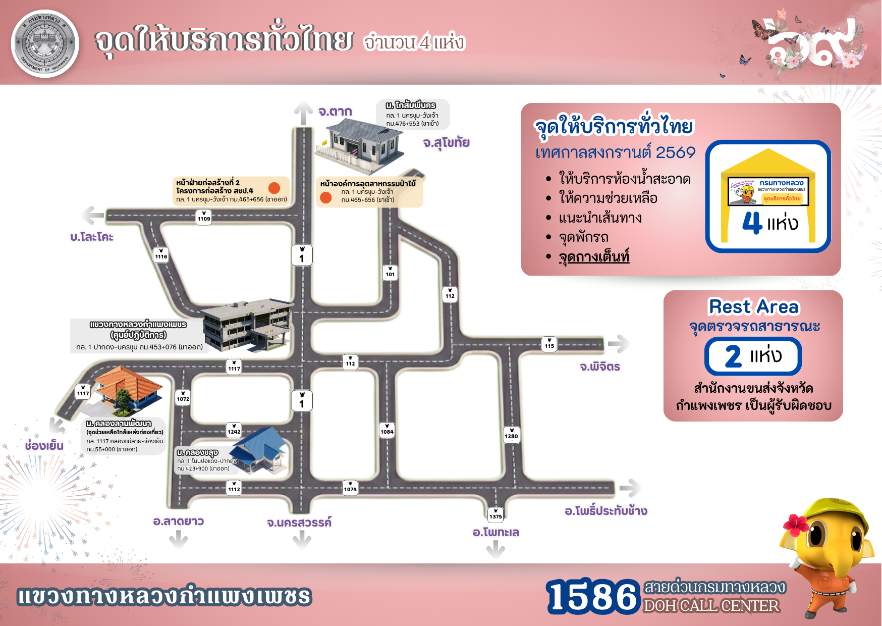 จัดตั้งศูนย์ปฏิบัติการอำนวยความสะดวกและปลอดภัยช่วงเทศกาลสงกรานต์ 2569 ณ บริเวณสำนักงานแขวงทางหลวงกำแพงเพชร ทางหลวงหมายเลข 1 ตอน ปากดง – นครชุม ที่ กม.453+076 ด้านซ้ายทาง หมายเลขโทรศัพท์ 0–5584–0747, 0–5584–0751 หมายเลขโทรสาร 0–5584–0748 หรือสายด่วนกรมทางหลวง 1586 และหมายเลข 1193 ตำรวจทางหลวง