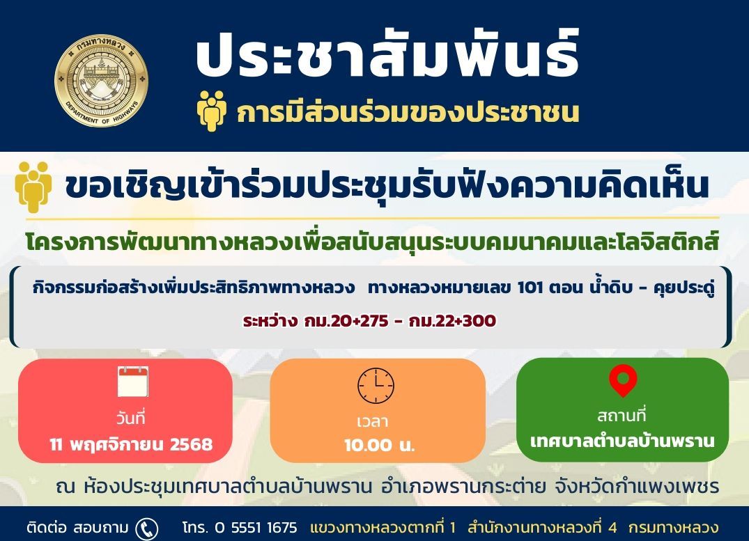 กิจกรรมการประชุมการมีส่วนร่วมของประชาชน ทล.101 ตอน น้ำดิบ - คุยประดู่ กม.30+725 - กม.32+750