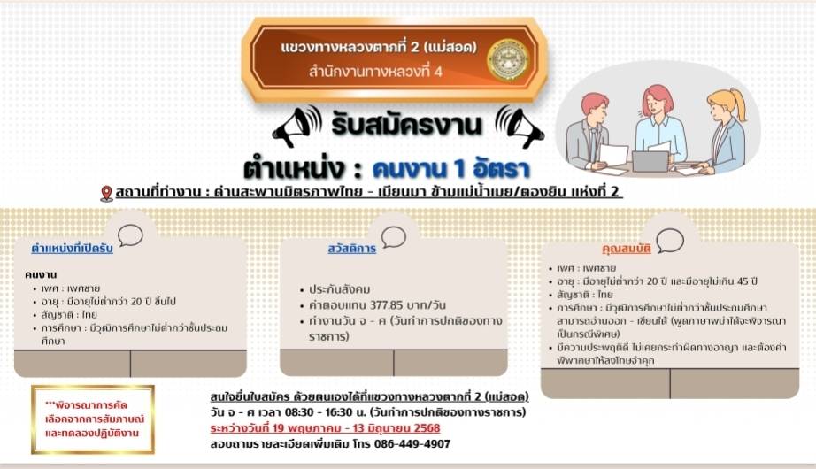 สนใจยื่นใบสมัครด้วยตนเองได้ที่แขวงทางหลวงตากที่ 2 (แม่สอด)