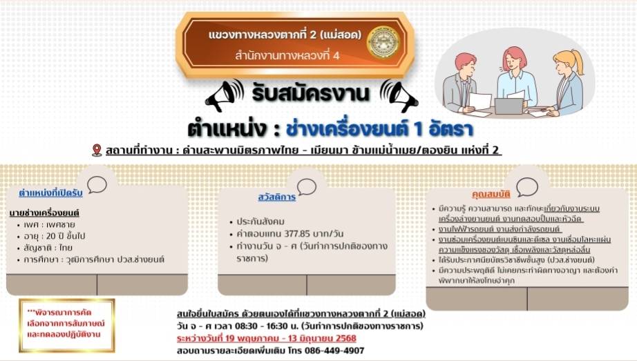 สนใจยื่นใบสมัครด้วยตนเองได้ที่แขวงทางหลวงตากที่ 2 (แม่สอด)
